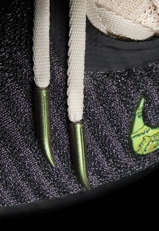 在这双球鞋上,最能体现对黑曼巴蛇致敬之处的莫过于鞋带了。这真是一个意想不到的地方。但仔细观察,其中的用意便一目了然。鞋带头并非我们常见的普通金属圆柱体,而是被精心雕琢成毒牙的形状。毒牙尖端闪烁着虹彩光泽,浑身散发着危险的气息。