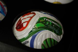 打开内层纸盖能看到adidas从1970年墨西哥世界杯比赛用球到最新的TRIONDA“三重浪”的共15颗足球的迷你版。