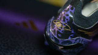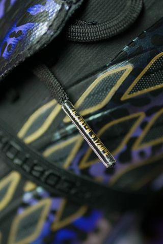 球鞋以黑色为主色调,鞋面有紫色渐变的美洲豹纹印花。鞋身外侧饰有标志性三条纹并搭配金色细节,提升整体质感。