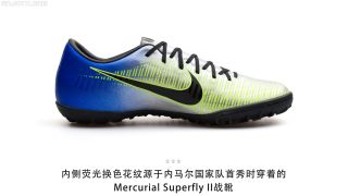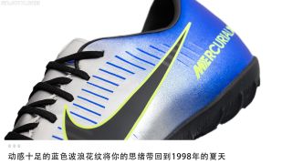 “Puro Fenomeno”是耐克为内马尔打造的第二款个人专属Mercurial战靴,这一系列战靴的设计灵感源于耐克在1998年为“外星人”罗纳尔多推出的Mercurial R9足球鞋。作为小场中端款式,MercurialX Victory VI NJR TF “Puro Fenomeno”外侧鞋面拥有与Mercurial R9相同的银蓝色外观,同时还标留了标志性的蓝色波浪条纹设计。而内侧鞋面上则加入源于Mercurial Superfly II足球鞋上的荧光黄色花纹。作为内马尔国家队首秀时穿着的战靴,他不仅穿着这款战靴出场,还攻入了他的国家队处子球。单从外观来看,虽为中端款式,但它同样能唤起你对这一经典战靴的回忆。