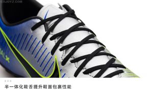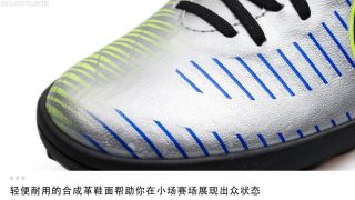 作为耐克为内马尔打造的全新“Puro Fenomeno”系列Mercurial战靴的中端产品,鞋面材质自然不能再使用成本高昂的Teijin人造超纤,同时提升高速带球时控球表现的Speed Ribs(速度纹理)也没有在鞋面上出现。轻便耐用的合成革成为这款中端小场战靴鞋面的标配,波浪形的蓝色速度纹理也以印花形式出现在鞋面上。虽然外观看起来与高端大场版本很相似,但实战效果还是要逊色了不少。当然,从实战角度来看,定位中端的全新MercurialX Victory VI NJR TF还是能够满足广大EZer们日常实战需求的。