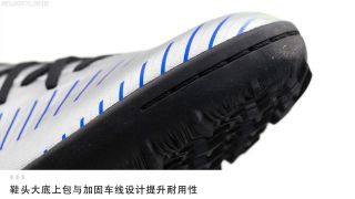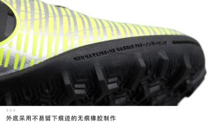 不管是地毯草还是塑胶地板场地,Nike MercurialX Victory VI NJR TF所采用的这款TF大底绝对能让你拥有与大场版本相同的速度表现。独特的三叉星形鞋钉比以往TF战靴采用的圆钉抓地力更强,帮助你用速度轻松突破对手防线。此外,如今小场足球场地不仅仅限于人造草场地,塑胶地板和室内木地板场地也越来越多。为了提升战靴的场地适应性,大底特意采用了无痕橡胶制作,以此提升球鞋的场地适应性。