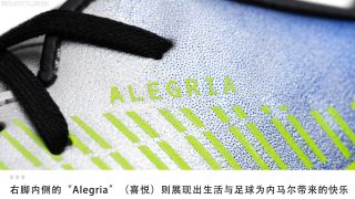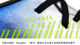 外形与高端大场版本类似,这意味着这双小场中端战靴的鞋面上除了加入致敬罗纳尔多的Mercurial R9元素外,内马尔的个人专属元素也会在鞋面上得以呈现。左右脚内侧鞋面分别加入展现内马尔人生信条的“Ousadia”(勇气)与“Alegria”(喜悦)字样,鞋垫与后跟上则加入内马尔个人专属标识,时刻提醒人们这款战靴的真正主人。