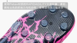 PUMA FUTURE 6.1 FG/AG使用的依旧是RAPIDAGILITY FG/AG大底,这款大底由轻量、高韧性的Pebax材料制作,鞋钉设计采用了兼顾灵巧性和抓地力的圆锥形鞋钉与刀钉混合,整体上与FUTURE灵巧、攻击型战靴的定位非常匹配。从实战角度来看,RAPIDAGILITY大底功能性出色,只不过对于国内玩家来说,鞋钉长度对于质量普通的人造草球场比较不友好。场地条件出色,EZer们可以选择FG/AG,条件一般就直接选MG。